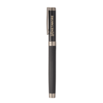 Exclusive The Brass Co® design. Shiny black upper barrel with linear pattern bottom barrel. Gunmetal accents. Cap off mechanism. Subtle The Brass Co® branding on pen clip and middle ring. Includes premium black German roller ball ink cartridge. Includes 2-piece The Brass Co® gift box.