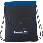 The Raven Drawstring Bag has an open main compartment with a cinching rope closure. It also features a zippered expandable gusset and a zippered front pocket with a convenient earbud port.