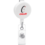 Retracting cord extends 32". Belt clip on back. Great for tradeshows and employee badges. Can also be used as a key ring holder.