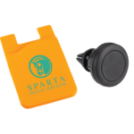 The Magnetic Phone Mount w/Silicone Wallet includes a silicone phone wallet and vent mount. With a magnetic plate that is planted into the silicone wallet you can magnetically connect your phone with the mount that clips into air vent of a car. This phone wallet is also a perfect way to hold cash or credit cards, etc.