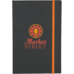Hard cover, bound journal. 96 sheets of cream lined paper features bright colored edges. Corresponding color elastic closure. Soft matte black cover highlights the most subtle or colorful logos. Please note deboss imprint has low contrast due to this item's cover material.