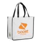 Perfect alternative to plastic bags. Open main compartment. Laminated material is water-resistant and easily wipes clean. Polypropylene non-woven reinforced handles and binding for added durability. 10" handle drop height.
