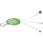 The Trebel 3-in-1 Light Up Logo Charging Cable features a USB A tip, a USB Type C tip, and a 2-in-1 dual compatible tip for both Apple® iOS and Android devices with 1.5A current. This item must be lasered to reveal the light up function. It comes with a carabiner.