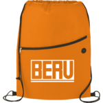 The Sidekick Non-Woven Drawstring Bag has an open main compartment with cinching rope closure. It also features a zippered front pocket with a handy earbud port and reinforced corner tabs.
