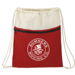 The Captain Cotton Drawstring Bag has an open main compartment with a cotton rope cinching closure. It also features a large zippered front pocket for additional organization and storage.
